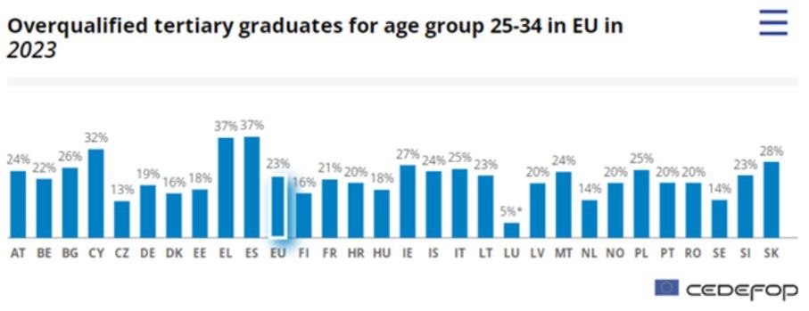 Nieco gorzej, jeśli chodzi o kraje unijne, wypadamy w zestawieniu osób pracujących poniżej kwalifikacji. Z danych CEDEFOP, czyli Europejskiego Centrum Rozwoju Kształcenia Zawodowego, unijnej instytucji zajmującej się kwestiami edukacyjnymi, wynika, że w naszym kraju co czwarta osoba z dyplomem wyższej uczelni (w grupie wiekowej 25-34 lata) jest "nadkwalifikowana" do wykonywanej pracy. Średnia unijna wynosi 23 proc. Najniższy odsetek osób "nadkwalifikowanych" jest w Luksemburgu. Tam zaledwie 5 proc. absolwentów wykonuje prace poniżej swoich kwalifikacji.