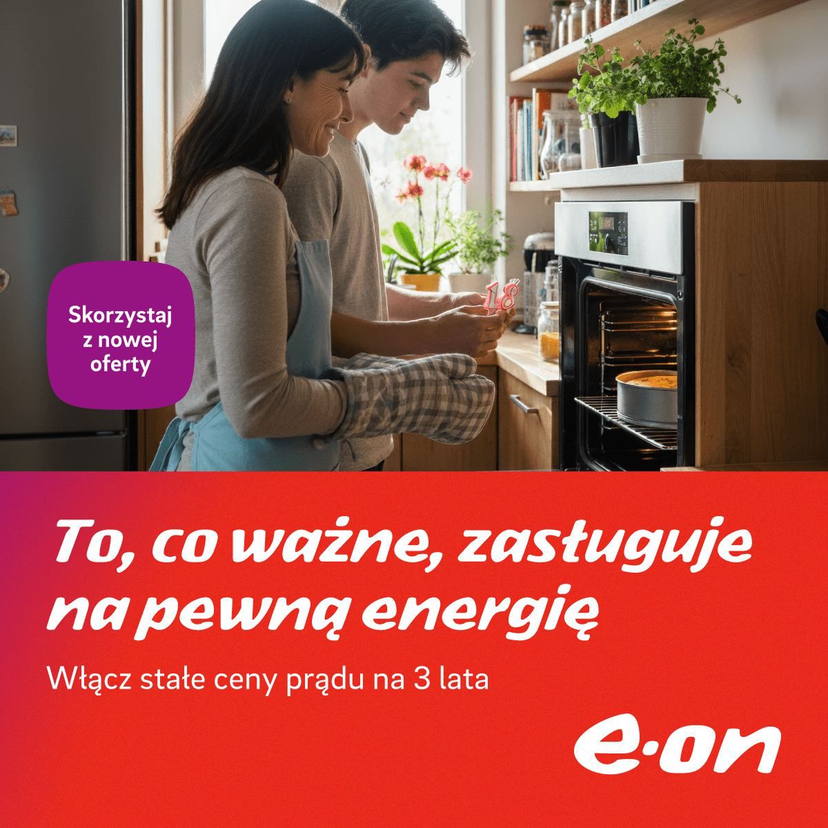 Energia elektryczna jest obecna w naszym życiu każdego dnia. Towarzyszy nam w małych, ale ważnych gestach i wspólnych chwilach z bliskimi. Dzięki ofercie "Pewna Energia z Gwarancją" przygotowanej przez E.ON Polska możemy celebrować te bezcenne momenty bez obaw o zmieniające się koszty. Stałe ceny prądu na najbliższe 3 lata pozwalają z wyprzedzeniem zaplanować wydatki na energię elektryczną w domowym budżecie i cieszyć się przewidywalnością przyszłych rachunków za prąd.