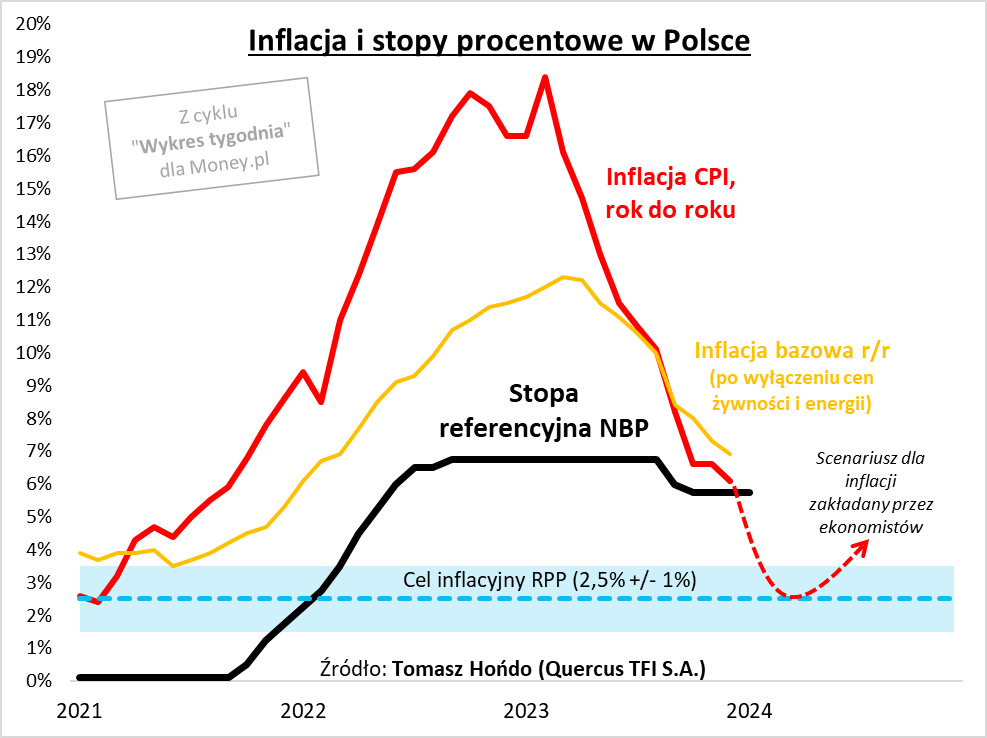 Kolejna dobra wiadomość jest taka, że w okolicach marca-kwietnia inflacja może zejść tak nisko, że znajdzie się w tzw. oficjalnym celu NBP (2,5 proc. +/- 1 proc.). Taki scenariusz, obstawiany przez coraz większą grupę ekonomistów (najdalej poszli eksperci Credit Agricole, prognozując 2,4 proc.), byłby przecież czymś niewyobrażalnym jeszcze kilkanaście miesięcy temu – to bez wątpienia duży pozytyw.