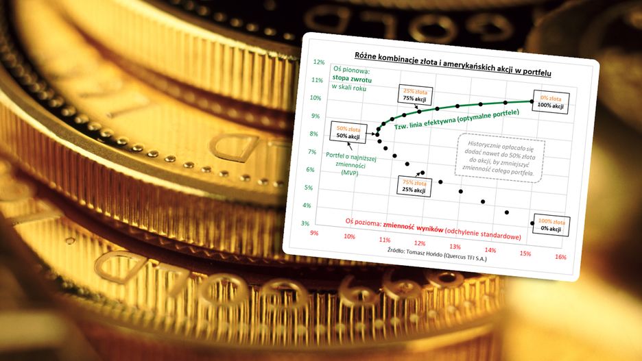 Dodanie 25 proc. złota do akcji oznaczałoby co prawda spadek zysku o nieco ponad 1 pkt proc. w skali roku, ale jednocześnie zmienność mierzona przez tzw. odchylenie standardowe obniżyłaby się aż o ok. 3 pkt proc. w skali roku.