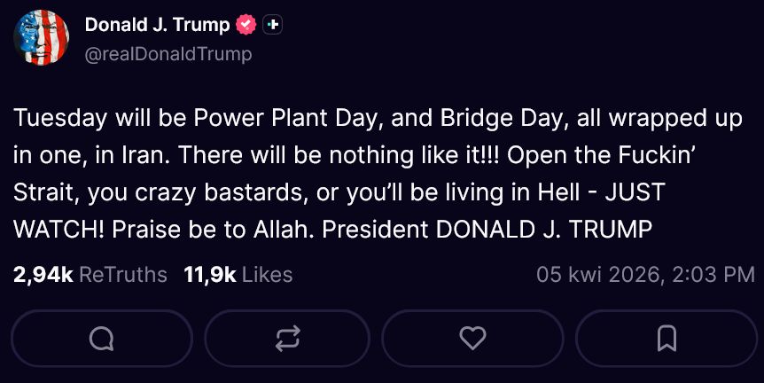 "We wtorek w Iranie będzie Dzień Elektrowni i Dzień Mostu. Otwórzcie tę p*******ną cieśninę, szalone bękarty, albo będziecie żyć w piekle - zobaczycie! Chwała Allahowi" - napisał prezydent USA Donald Trump na swojej platformie społecznościowej Truth Social.