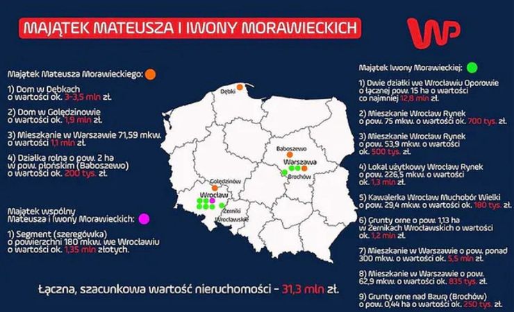 Majątek premiera Mateusza Morawieckiego i jego żony Iwony Morawieckiej ujawnili w 2021 r. dziennikarze Wirtualnej Polski. Z artykułu Szymona Jadczaka i Patryka Słowika wynika, że żona premiera ma między innymi dwa mieszkania na warszawskim Mokotowie, 15 hektarów ziemi we Wrocławiu, półhektarową działkę nad Bzurą, a także dwa mieszkania i lokal użytkowy w kamienicy przy wrocławskim rynku. Szacunkowa wartość majątku premiera i jego żony to ok. 40 mln zł. Całość można przeczytać tutaj.