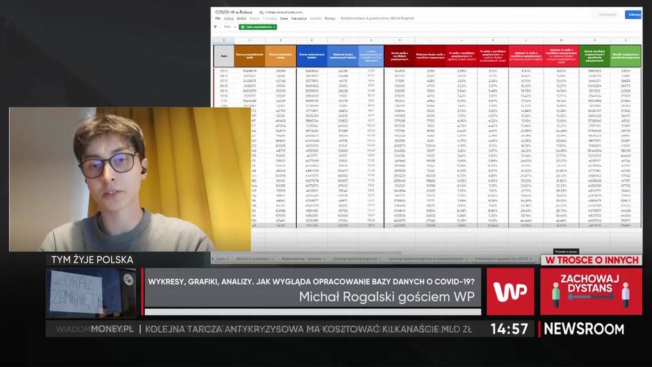 - Moja praca to obywatelski obowiązek, robię to jako wolontariusz - mówił w programie "Newsroom" Michał Rogalski, który samodzielnie prowadzi i udostępnia w internecie bazę danych o pandemii w naszym kraju. Jak wyjaśniał, uważa, że dostęp do szerokich danych sprawia, że ludzie przestają się bać. - Ogromna społeczność wytworzyła się wokół tego arkusza, dziennie kilka tysięcy osób korzysta z niego. Ta społeczność też sama sobie pomaga, wyjaśnia, robi wizualizacje. To obywatelska baza danych - mówił, podkreślając, że resort zdrowia tak szerokich danych nie udostępnia.