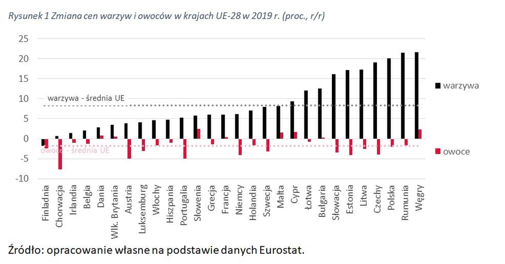 W przypadku owoców na 28 krajów UE w 9 odnotowano wzrost cen – najwyższe w Słowenii (2,4 proc.) i Węgrzech (2,3 proc.), a najniższe w Bułgarii (0,3 proc.) i Francji (0,4 proc.). W porównaniu do roku poprzedniego w 19 krajach odnotowano spadek cen, z czego najsilniej w Chorwacji (-7,7 proc.) oraz Austrii (-5,0 proc.). Najsłabiej zaś na Łotwie (-0,8 proc.), Hiszpanii i Irlandii (po -1,0 proc.). W Polsce spadek wyniósł -2,0 proc., ale trzeba pamiętać, że w 2017 r. byliśmy rekordzistami wzrostu cen owoców (8,5 proc.) zaraz po Słowenii (9,0 proc.).