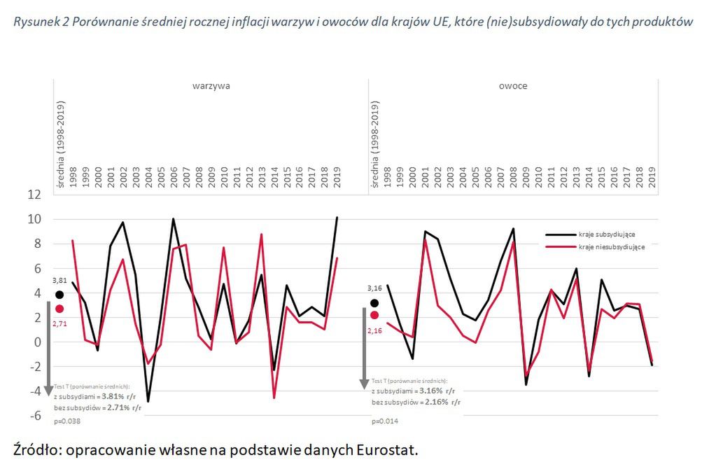 Średnioroczna dynamika cen warzyw w krajach subsydiujących wyniosła 3,8 proc. r/r., podczas gdy w krajach, gdzie między 1998 a 2019 r. nie dopłacano była niższa o ponad 1 pkt proc. – 2,71 proc. W przypadku owoców sytuacja jest identyczna, przy czym wartości dla subsydiujących to 3,2 proc. a niesubsydiujących 2,2 proc.
