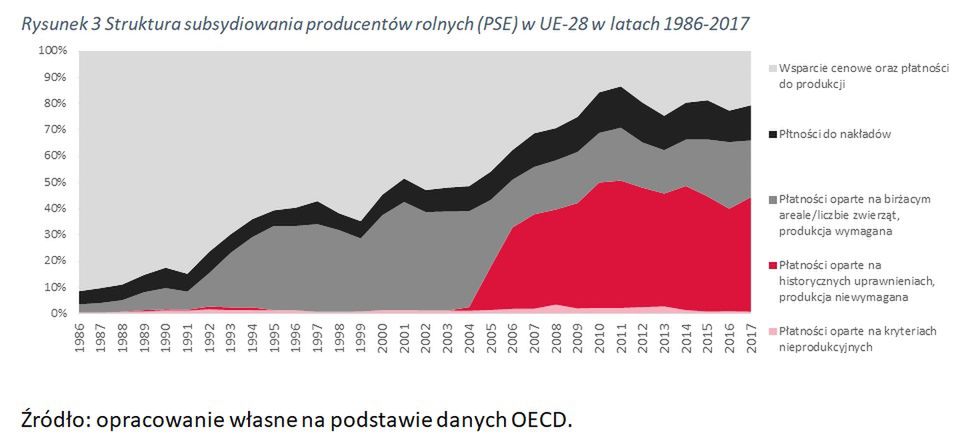 Na przestrzeni 30 lat struktura wskaźnika wsparcia dla producentów rolnych (PSE) w UE-28 przeszła znaczące przekształcenia. Zmiany te w okresie 1986-2017 widać już gołym okiem spoglądając tylko na poniższy wykres. O ile trzy dekady temu wsparcie cenowe oraz płatności do produkcji stanowiły ponad 90 proc. ogółu, o tyle najaktualniejsze dostępne dane pokazują, że dziś to płatności oparte na historycznych uprawnieniach dominują (47 proc.). W UE dostrzeżono bowiem, że płatności związane z bieżącym poziomem produkcji skutkują nadwyżkami podaży. Wobec czego reforma z 2003 r nazwana najbardziej radykalną reformą WPR wszech czasów wdrożyła płatności niezwiązane z bieżącą produkcją.