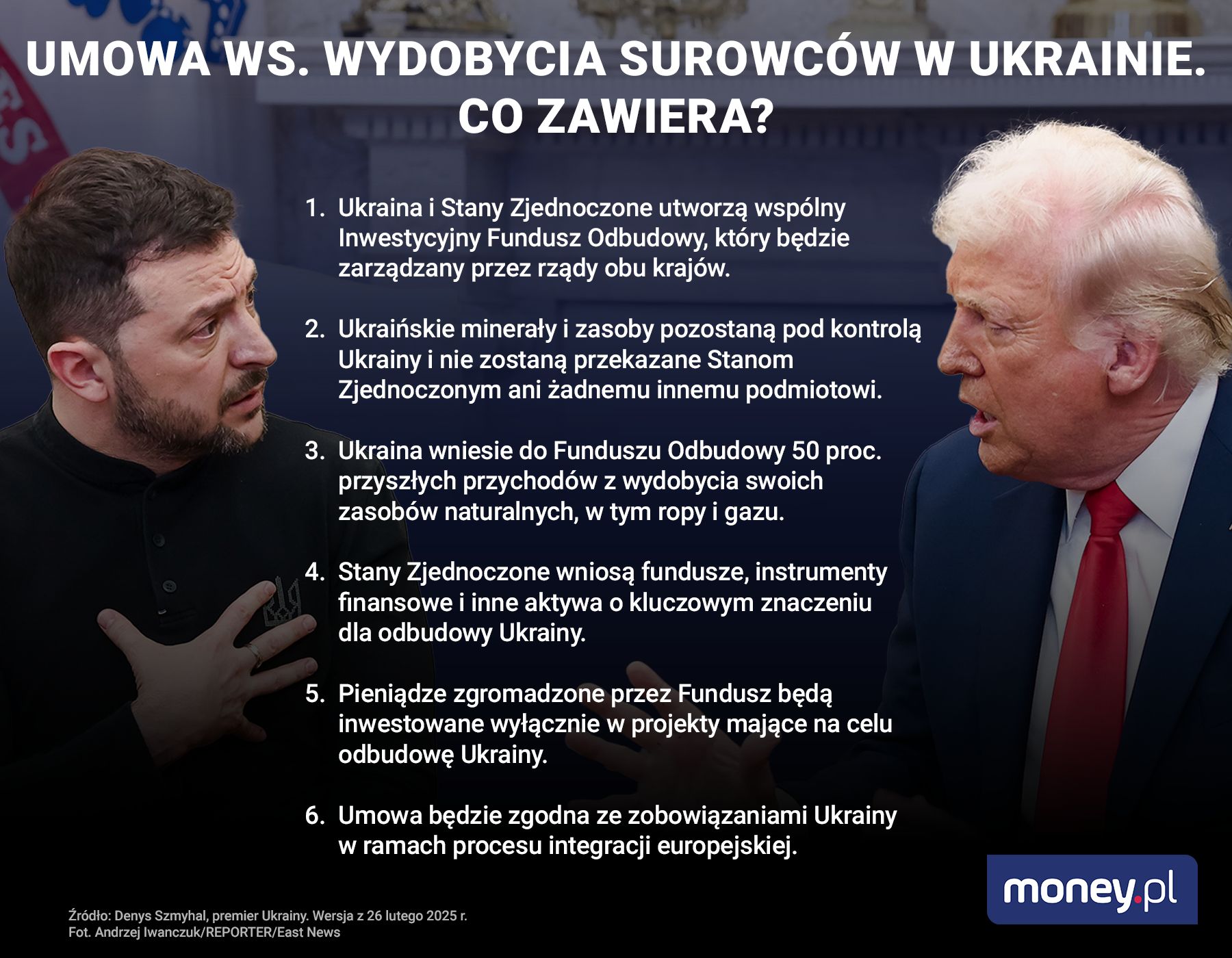 Portal Europejska Prawda informował w ubiegłym tygodniu, jeszcze przed spotkaniem Donalda Trumpa i Wołodymyra Zełenskiego, które zakończyło się wymianą zdań, że umowa między Stanami Zjednoczonymi a Ukrainą, która miała zostać podpisana przewiduje utworzenie Inwestycyjnego Funduszu Odbudowy, finansowanego m.in. z wydobycia złóż, włącznie z ropą i gazem, do którego Ukraina będzie przekazywać 50 proc. wpływów z tego tytułu.