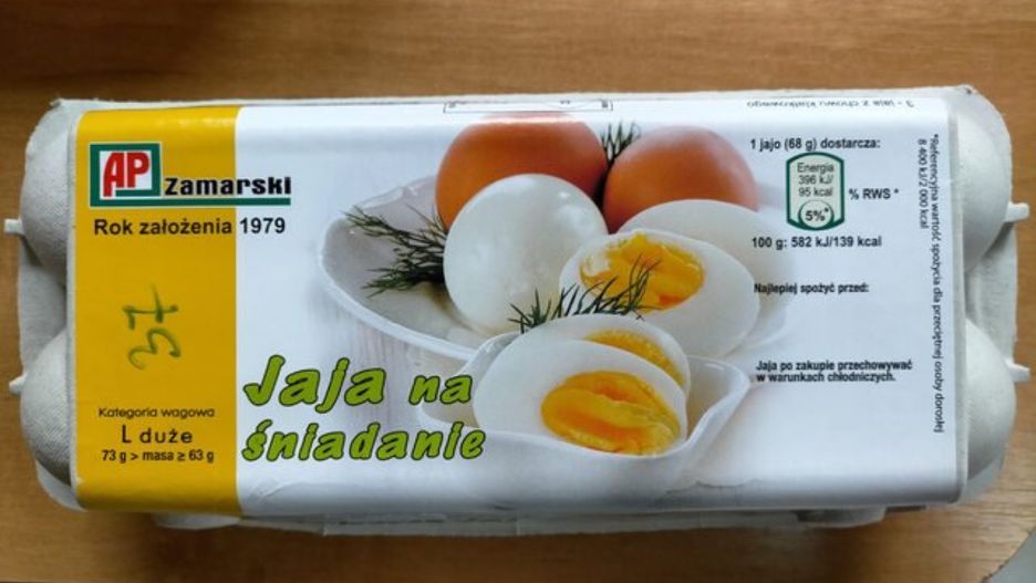 - jaja na śniadanie AP Zamarski, pakowane po 10 sztuk, klasa A, kategoria wagowa L, 10 szt. z datą spożycia - 08.05.2021 i kodem na skorupkach jaj: 3PL24031301