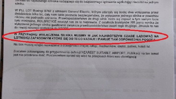 Kilkanaście stron jest przypomnieniem obowiązujących przepisów i podkreśleniem, że Dreamlinery powinny lądować jak najszybciej po wykryciu usterki w którymkolwiek z silników. Dlaczego? "Bo wyłączenie jednego silnika gwałtowanie zwiększa prawdopodobieństwo awarii tego drugiego. Zmusza to nas do rewizji naszego podejścia do ETOPS". To nie są nasze wnioski. To wnioski z samego LOT-u.