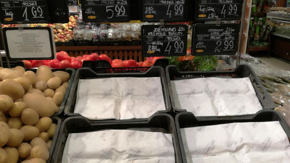 I faktycznie, w niektórych sklepach jest mniej towaru. W jednej z gdańskich placówek brakuje kilku rodzajów ziemniaków. Zwykle były dostępne od ręki. Nieco "biedniejsza" jest również półka ze świeżym pieczywem.