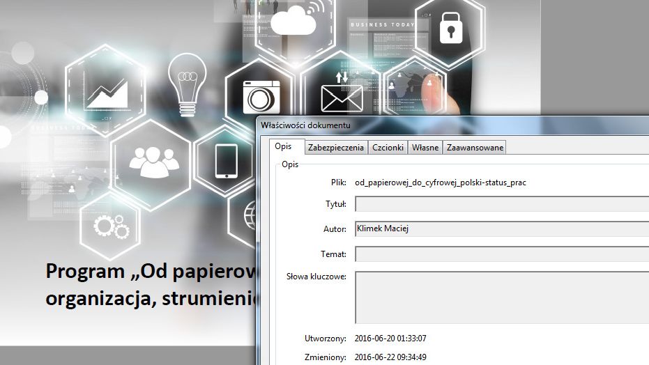 Na stronie Ministerstwa Cyfryzacji program Od papierowej do cyfrowej Polski jest opublikowany w formie prezentacji pdf. Gdy pobierzemy ten plik i zajrzymy do właściwości dokumentu, okazuje się, że jako autor figuruje w nim Maciej Klimek. Zazwyczaj jako autor tego typu dokumentów rządowych występuje pracownik biura prasowego któregoś z resortów, ale w tym przypadku jest inaczej. Maciej Klimek nie jest bowiem osobą zatrudnioną w Ministerstwie Cyfryzacji, lecz wysokim rangą pracownikiem polskiego oddziału Boston Consulting Group.