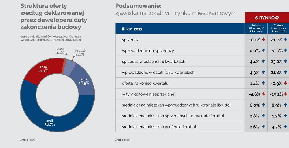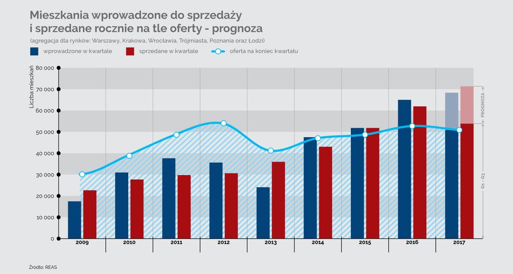 REAS prognozuje, że końcówka roku będzie kontynuacją trendu wznoszącego. - Bardzo dobre wyniki sprzedaży w III kwartale uzasadniają prognozę rekordowej liczby transakcji w całym 2017 r. Podaż w perspektywie całego roku będzie zapewne nieco niższa od sprzedaży, ale nie na tyle, aby oferta znacząco zmalała - czytamy.