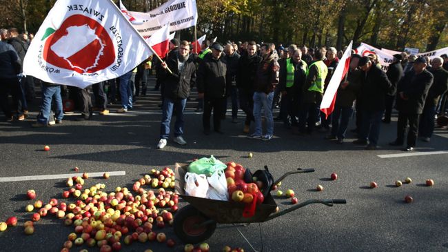 Kilkuset osób domaga się pomocy ze strony państwa dla producentów owoców, którzy ponieśli straty w wyniku rosyjskiego embarga. Jak mówił podczas protestu prezes Związku Sadowników RP Mirosław Maliszewski, sytuacja sadowników jest tragiczna. Nie mają oni możliwości sprzedaży nadwyżki jabłek, które wcześniej eksportowane były do Rosji.