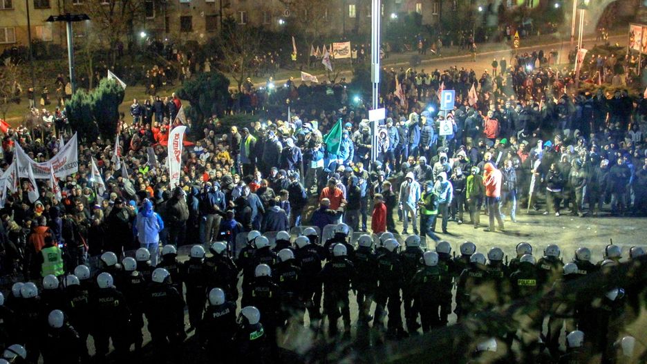 Uczestnicy protestu, jak poinformowano, najpierw zgromadzili się przed stadionem piłkarskim, skąd ruszyli ulicami miasta w kierunku Domu Muzyki i Tańca (DMiT), gdzie odbywała doroczna gala Laurów Kompetencji i Umiejętności. - _ Do protestujących przyłączyły się grupy pseudokibiców. Wielu z nich znajdowało się pod wpływem alkoholu i już w trakcie marszu wykazywało agresywne zachowanie. Po dotarciu pod Dom Muzyki i Tańca tłum sforsował bariery ochronne zabezpieczające teren, a w kierunku budynku rzuconych zostało kilkadziesiąt rac i petard hukowych _ - podała policja.