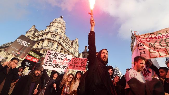 Odpalono czerwone race, gdy tłum wyruszył spod siedziby Bank of England. Nad londyńskim City uniósł się szkarłatny dym. Przygrywała orkiestra dęta, demonstranci zmierzający w kierunku Parliament Square nieśli transparenty i kolorowe baloniki. Pojawiły się wizerunki konserwatywnego premiera Davida Camerona z diabelskimi rogami i hasła wzywające do położenia kresu rządom torysów.