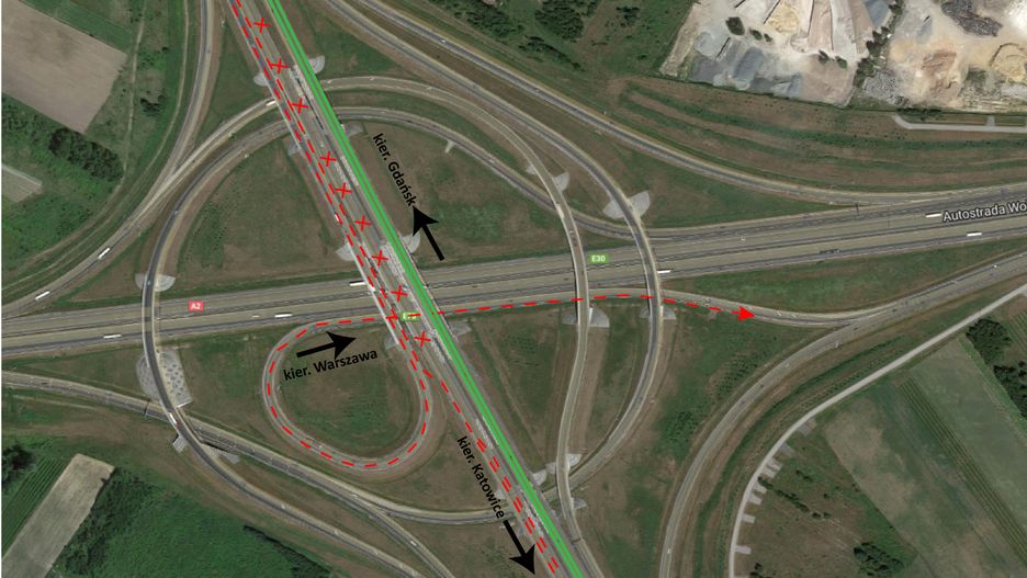 Zmiany w organizacji ruchu dotyczą podróżujących A1 zarówno na północ, jak i południe Polski. Nowa organizacja ruchu zlikwidowała obecne przewiązki i ruch w obu kierunkach po wschodniej nitce autostrady A1 w obrębie węzła. Kierowcy jadący z północy na południe korzystają już z łącznicy zjazdowej na Warszawę, a tuż za wiaduktem węzła wracają poprzez tymczasową przewiązkę na jezdnię główną w kierunku Katowic.