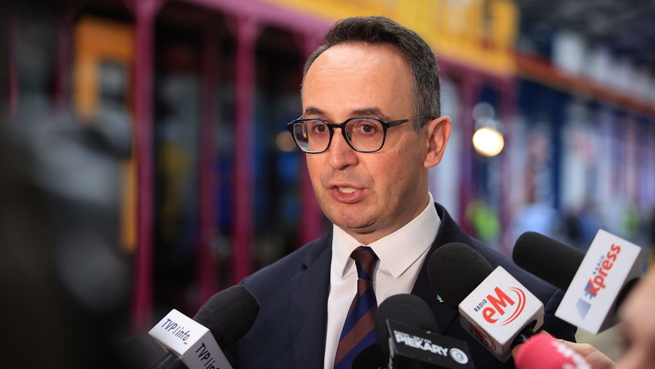 Chorzów, 12.11.2025. Minister infrastruktury Dariusz Klimczak podczas wizyty w Zakładzie Produkcji Taboru Kolejowego w Chorzowie, 12 bm. Spotkanie dot. podpisania umowy na dostawę piętrowych pociągów dla PKP Intercity. (mr) PAP/Jarek PraszkiewiczMinister infrastruktury Dariusz Klimczak
