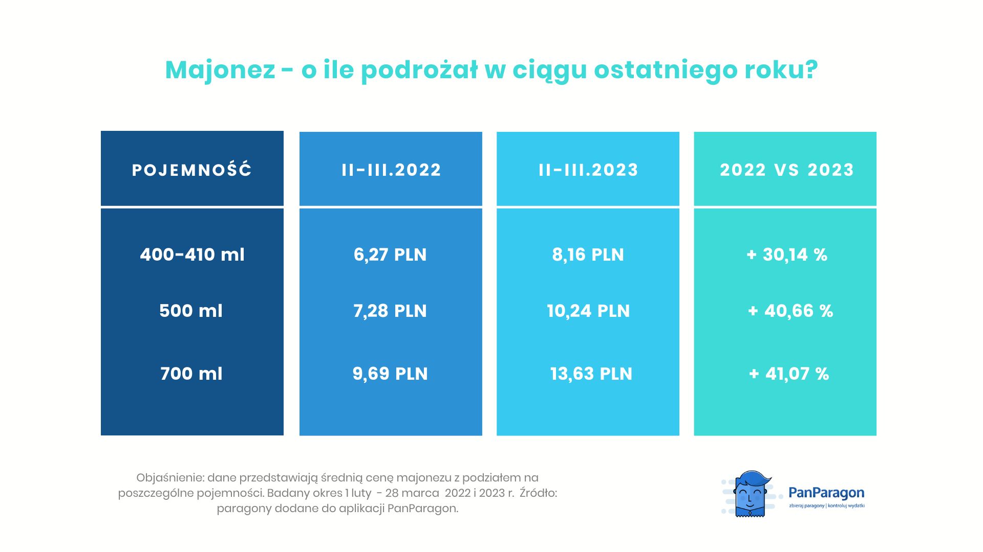 "Jak się okazuje, im mniejszy majonez, tym mniejsza podwyżka. Słoik majonezu o pojemnościach 400 lub 410 ml w ciągu jednego roku podrożał z około 6 zł 27 gr do 8 zł 16 gr., wykazując tym samym wzrost o 30 proc. Większą zmianę w cenniku, na niekorzyść konsumentów, odnotowano w przypadku pojemności 500 ml. W ciągu zaledwie jednego roku cena za ten produkt o takie pojemności wzrosła o ponad 40 proc. Jednak z największą podwyżką muszą zmierzyć się osoby, które przed świętami stawiają na duże słoiki majonezu. W 2022 roku 700 ml tego produktu kosztowało średnio 9 zł 69 gr, rok później cena wzrosła do około 13 zł 67 gr. To stanowi 41,07 proc. wzrostu - czytamy w najnowszej analizie aplikacji PanParagon.