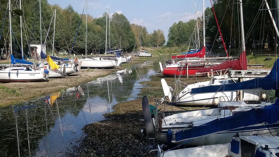Jachty stoją na piasku, pomosty kończą się przed taflą wody. Niektórzy żeglarze zdążyli zabrać swoje łódki, ale większość osiadła na mieliźnie.