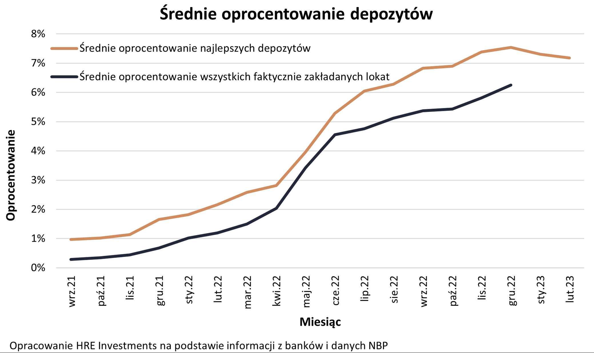 W lutym najlepsze bankowe lokaty i konta oszczędnościowe kusiły oprocentowaniem na poziomie średnio 7,18 proc., podczas gdy w styczniu było to 7,3 proc. - podali w poniedziałek analitycy HRE Investments Oskar Sękowski i Bartosz Turek. Nowy rok przyniósł dużą zmianę w trendzie, bo wcześniej przez 15 miesięcy średnie oprocentowanie depozytów rosło, i to w bezprecedensowym tempie - zaznaczają eksperci. Pod koniec 2021 roku sięgało bowiem zaledwie jednego procenta.