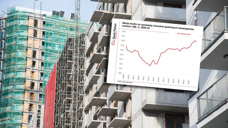W piątek analitycy Banku Pekao opublikowali analizę, z której wynika, że marża brutto uzyskiwana ze sprzedaży mieszkań przez giełdowych deweloperów po trzecim kwartale 2023 roku to 31,4 proc. (dane za ostatnie cztery kwartały). "Jest najwyższa od ponad dekady" - skomentowali eksperci.