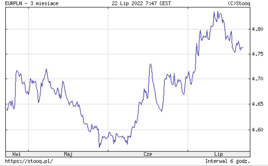 Kurs euro - 22.07.2022. W piątek za jedno euro (EUR) zapłacimy 4.7629 zł. Na skutek zawirowań gospodarczych, rosnących cen surowców, wysokiej inflacji i kryzysu wywołanego przez wojnę w Ukrainie, złoty w ostatnich miesiącach znacznie osłabił się wobec euro, które jednocześnie osiągnęło w lipcu parytet wobec dolara.