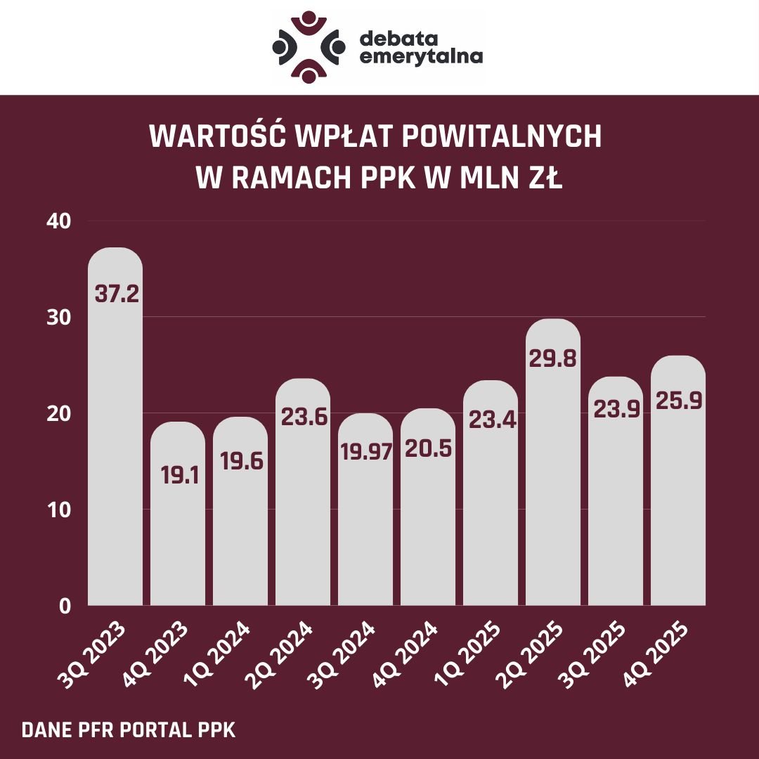 Jak informuje PFR Portal PPK, wpłaty powitalne za czwarty kwartał 2025 pojawią się na rachunkach uczestników do 15 lutego 2026 roku. Otrzyma je około 104 tysięcy uczestników (tyle osób dołączyło do PPK we wspomnianym okresie i spełniło warunki do uzyskania wpłaty powitalnej) na łączną kwotę niemal 24 mln zł. W sumie od początku funkcjonowania PPK na rachunki uczestników PPK przekazano już 948 mln zł w formie samych wpłat powitalnych.