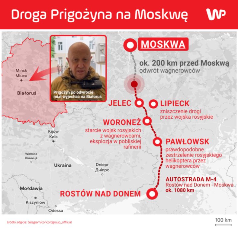 W piątek Prigożyn stwierdził, że oddziały rosyjskiej regularnej armii zaatakowały obóz jego najemników powodując liczne ofiary. Zapowiedział "przywrócenie sprawiedliwości" w armii i domagał się odsunięcia od władzy skonfliktowanego z nim ministra obrony Siergieja Szojgu, a następnie skierował swoje siły na Moskwę. Jednak po upływie doby, w sobotę wieczorem, Prigożyn ogłosił odwrót i skierowanie najemników na powrót do obozów polowych. Miało to być rezultatem negocjacji Alaksandra Łukaszenki z Prigożynem, prowadzonych w porozumieniu z Władimirem Putinem. Prigożyn wyjedzie na Białoruś w ramach porozumienia kończącego zbrojny bunt.