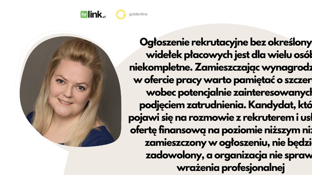 – Ogłoszenie rekrutacyjne bez określonych widełek płacowych jest dla wielu osób niekompletne. Zamieszczając wynagrodzenie w ofercie pracy warto pamiętać o szczerości wobec potencjalnie zainteresowanych podjęciem zatrudnienia. Kandydat, który pojawi się na rozmowie z rekruterem i usłyszy ofertę finansową na poziomie niższym niż ten zamieszczony w ogłoszeniu, nie będzie zadowolony, a organizacja nie sprawi wrażenia profesjonalnej. – mówi Alina Michałek, ekspert HR w HRlink i Goldenline.